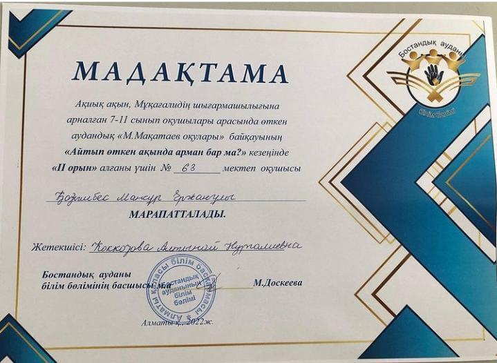 Бостандық ауданы білім бөлімінің ұйымдастыруымен ақын М.Мақатаевтың оқуларынан "Айтып өткен ақында арман бар ма?" кезеңінде ІІ орын алған оқушымыз Қазымбек Мансұрды, жетекшісі Коккозова Алтынай Нургалиевнаны шын жүректен құттықтаймыз